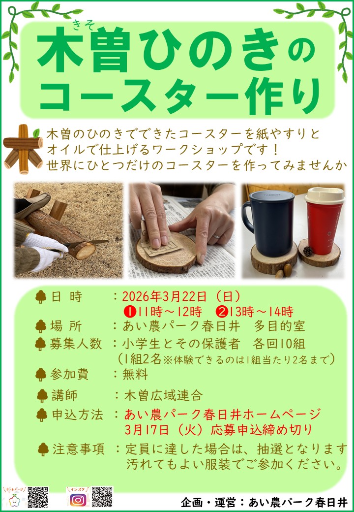| 講座名 | 3/22(日)「木曽のひのきのコースター作り」 |